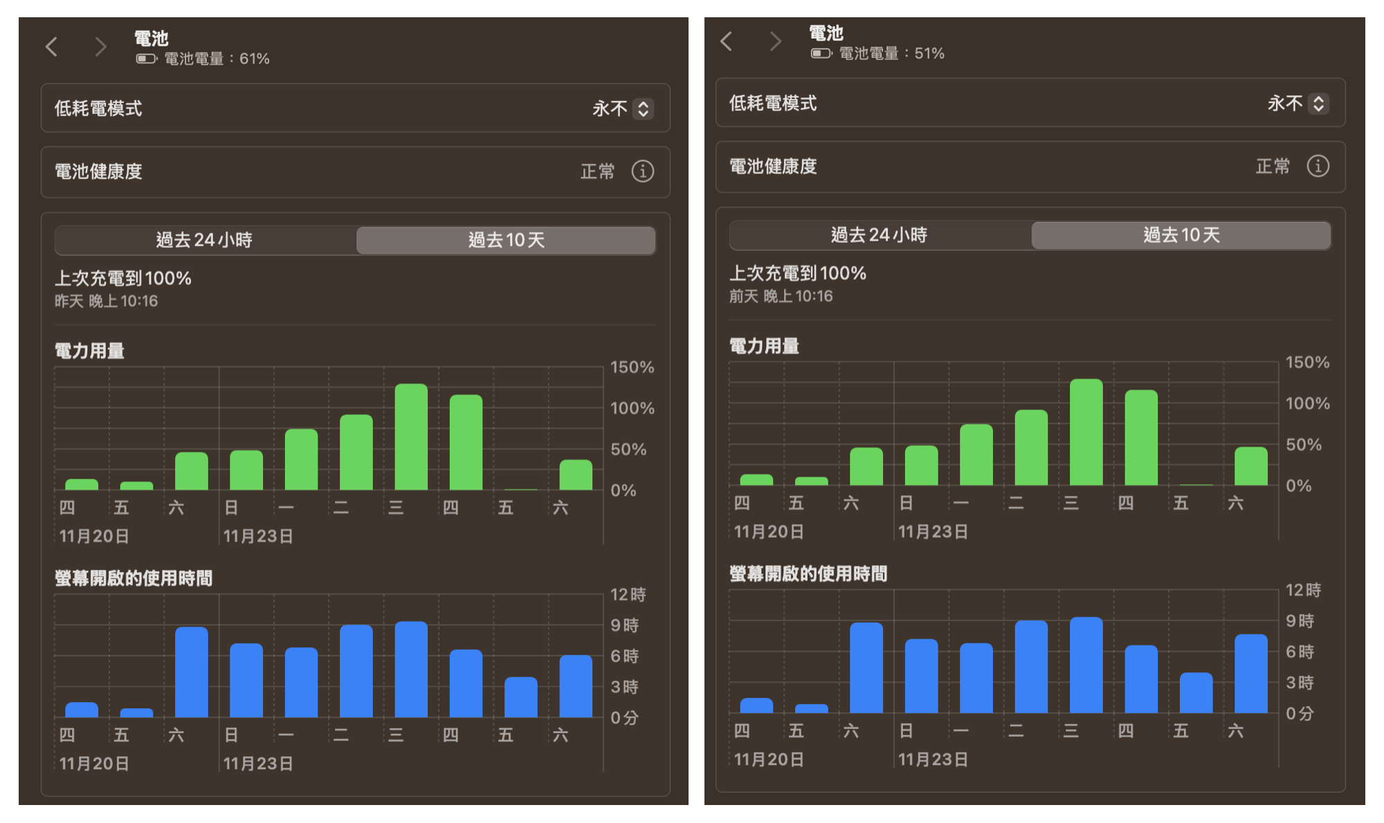 截圖裡面的「上次充電到100%」是在禮拜五晚上 10:16。